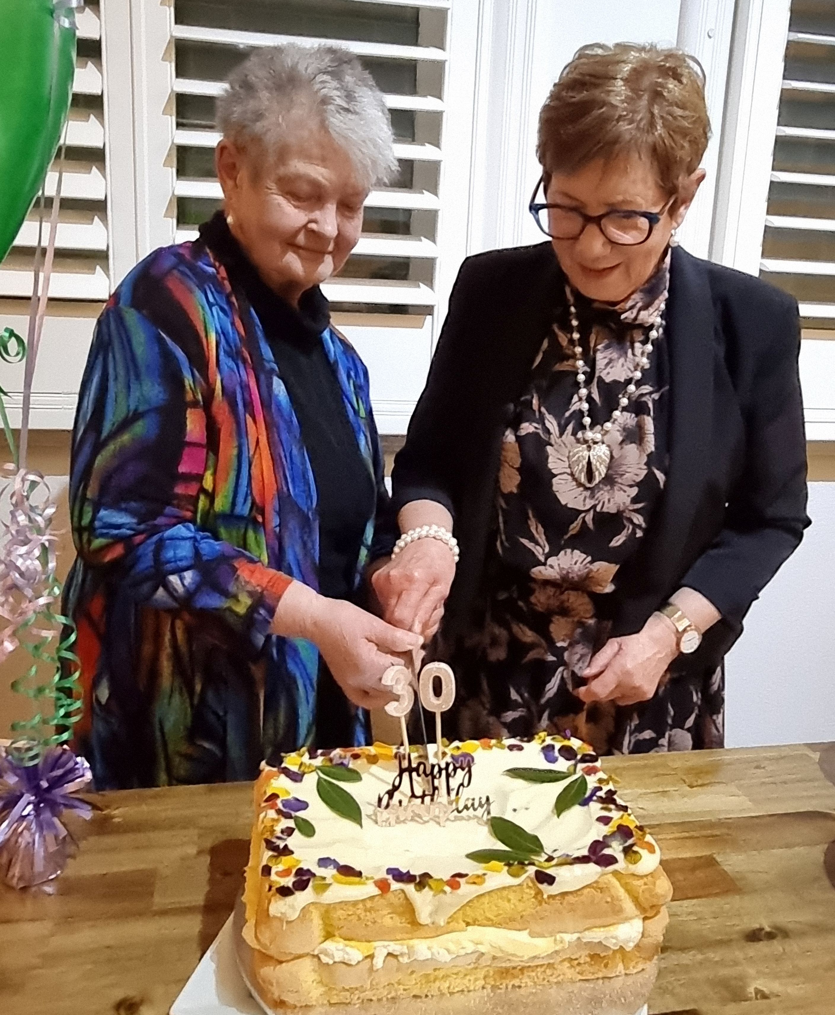 Current President Jen, and founding member Ruth, cut the delicious passionfruit sponge.